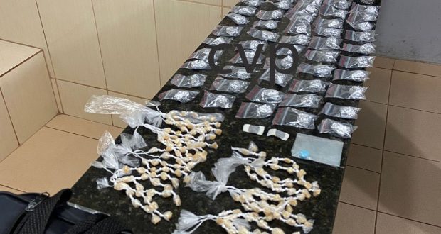 De acordo com informações, as equipes da Força Tática e motos da ROCAM estavam em operação policial no CDHU, quando os policiais se depararam com S.A.S, de 22 anos, no condomínio seis. Este carregava uma embalagem nas mãos e uma pochete na cintura. Ao avistar os policiais, ele saiu correndo para o condomínio dois. O suspeito passou subir as escadas do bloco três e gritar para os moradores abrir as portas. Ao ver que seria abordado, acabou dispensando a sacola e a pochete. Em revista pessoal, foram localizados com S.A.S,R$ 220,00. Maconha, crack e cocaína foram localizados nos objetos que o sujeito dispensou escada a baixo. Ele foi encaminhado para a Central de Polícia Judiciária, autuado em flagrante por tráfico de drogas e recolhido ao Centro de Triagem de São Carlos.