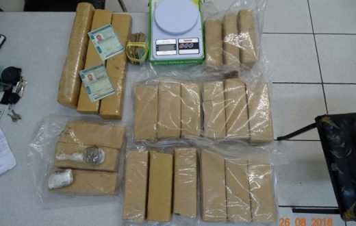Os policiais efetuaram patrulhamento e localizaram o carro dos rapazes no Jardim América. Os ocupantes de 25 e 30 anos foram abordados e, em revistas ao veículo, os policiais encontraram dois tijolos de maconha de cerca de 2 quilos, escondidos na lataria da porta do veículo.