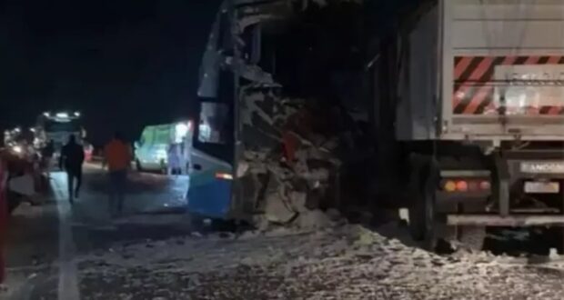 Um acidente entre uma carreta e um ônibus de viagem deixou 11 mortos e pelo menos 45 feridos. A colisão frontal ocorreu por volta das 21h40 dessa sexta-feira (8/8), no km 648 da BR-163, próximo a comunidade São Cristóvão, em Lucas do Rio Verde (MT). A pista está liberada. Segundo informações da Polícia Rodoviária Federal (PRF), a carreta transportava caroço de algodão. A empresa responsável pelo ônibus informou que o veículo saiu de Cuiabá com destino a Sinop.