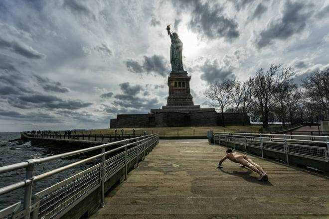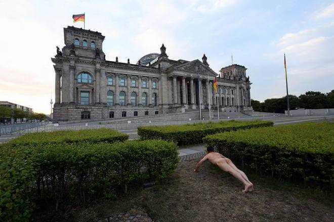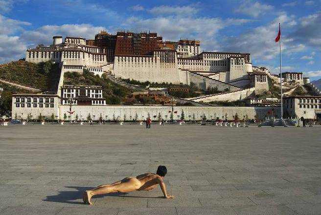 O apresentador chinês Ou Zhihang ganhou os noticiários do mundo por conta de uma série de fotos em que ele aparece fazendo flexão pelado em diversos locais.