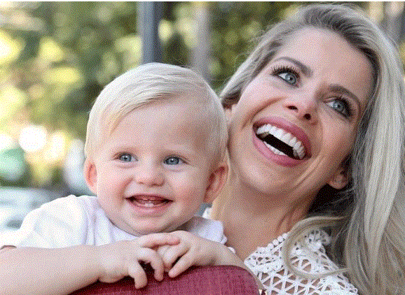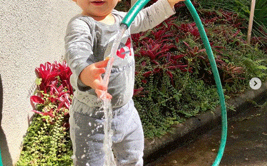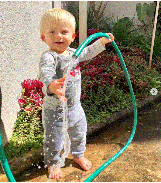 No Instagram, a loira mostrou um momento íntimo do filho em que ele aparece brincando com uma mangueira esguichando água.