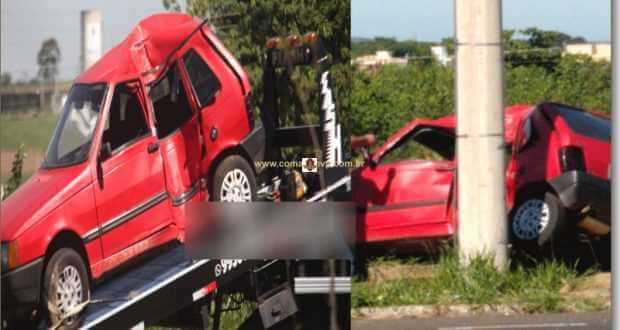 Um Uno ficou destruído nesta manhã de sábado, 4 de abril de 2020, ao colidir em um poste na Avenida Bruno Rugierro Filho, bairro Santa Felícia, São Carlos-SP.