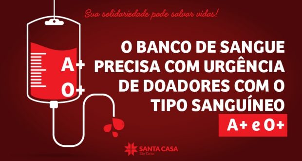 *24 de março de 2021* – O Banco de Sangue da Santa Casa de São Carlos-SP precisa urgentemente de doações dos tipos A e O positivo. Os estoques dos tipos A positivo estão 60% abaixo do ideal e os de O positivo, 40% abaixo do ideal.