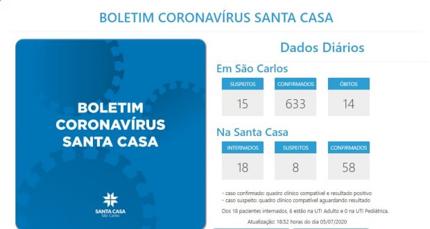 Na Santa Casa, o número de confirmados, do início da pandemia até agora, é de 58 casos. 6 pacientes diagnosticados com COVID-19 estão internados, 38 receberam alta e são 14 óbitos.