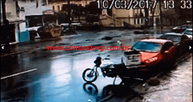 O acidente aconteceu por volta das 13:30 do dia 10-03-2017. No dia estava chovendo e o motociclista foi jogado na enxurrada. Aparentemente ele não se feriu com gravide, pois levanta e sai andando. O motorista do carro estaciona e presta socorro a vítima.