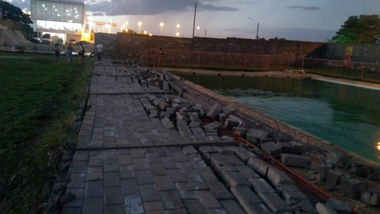 No Cidade Aracy II parte do muro da piscina do Centro da Juventude Lauriberto José Reyes também foi derrubada com a força do vento.