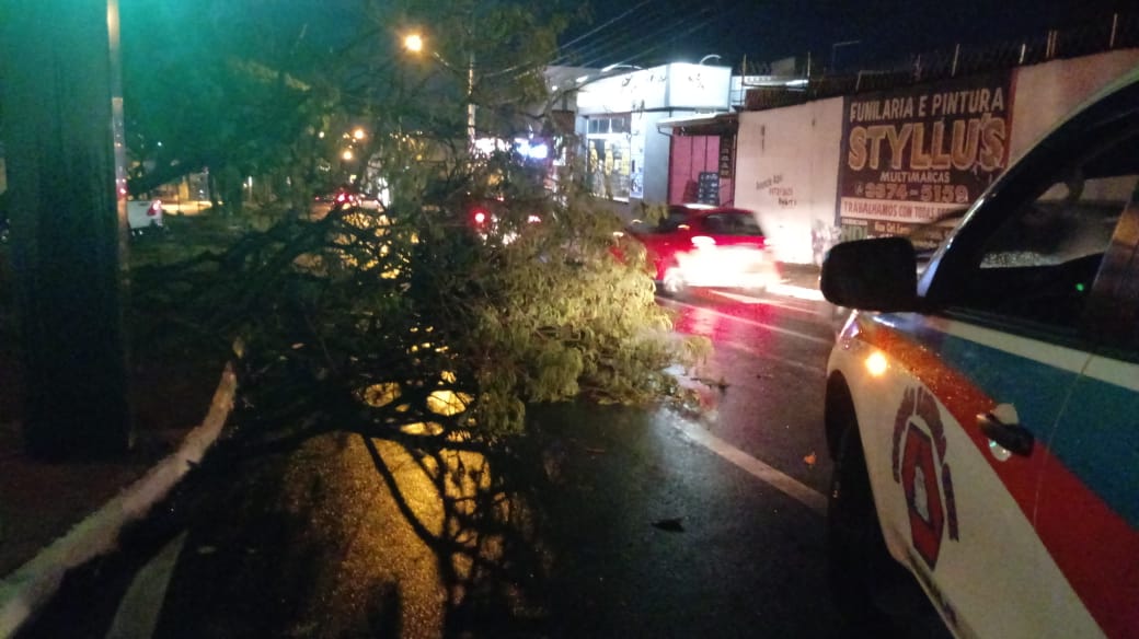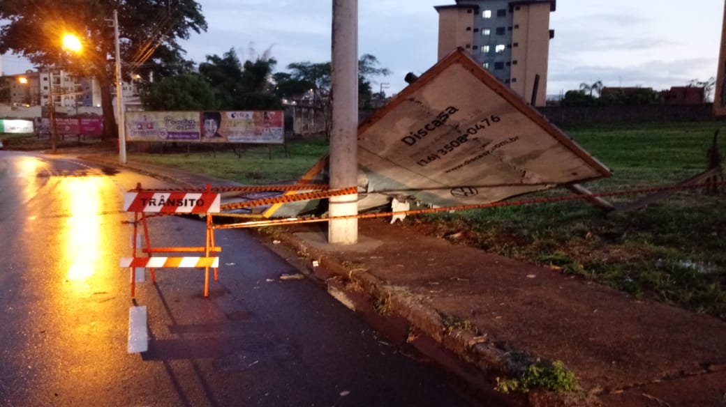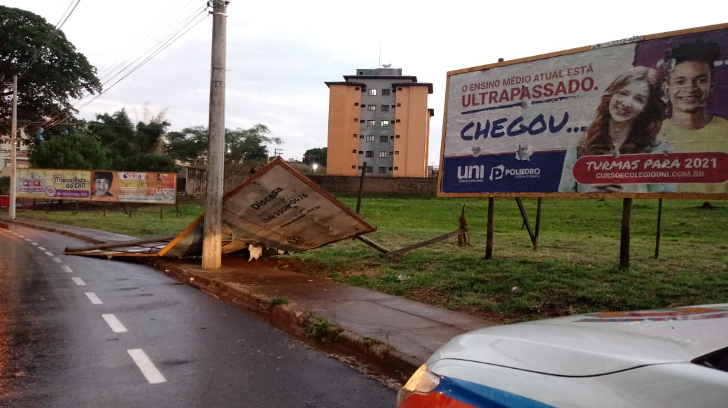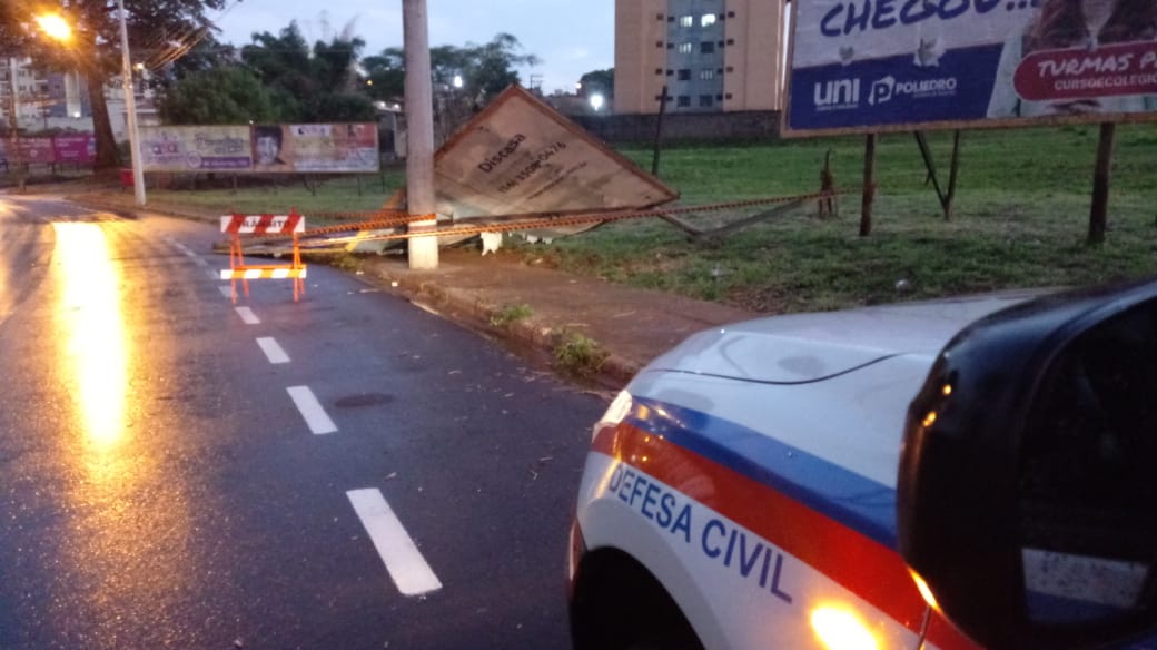 Na avenida Comendador Alfredo Maffei um outdoor foi derrubado pela força do vento. No Jardim Medeiros duas árvores caíram com comprometimento da rede elétrica. A CPFL já está trabalhando no local.