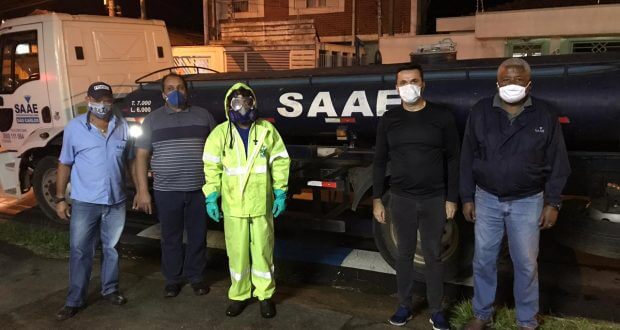 Na desinfecção que já vem ocorrendo na cidade a pedido do vereador, estão sendo utilizados caminhões pipas, com o apoio do SAAE que lavam os locais mais frequentados pela população usando hipoclorito de sódio (cloro) ativo.