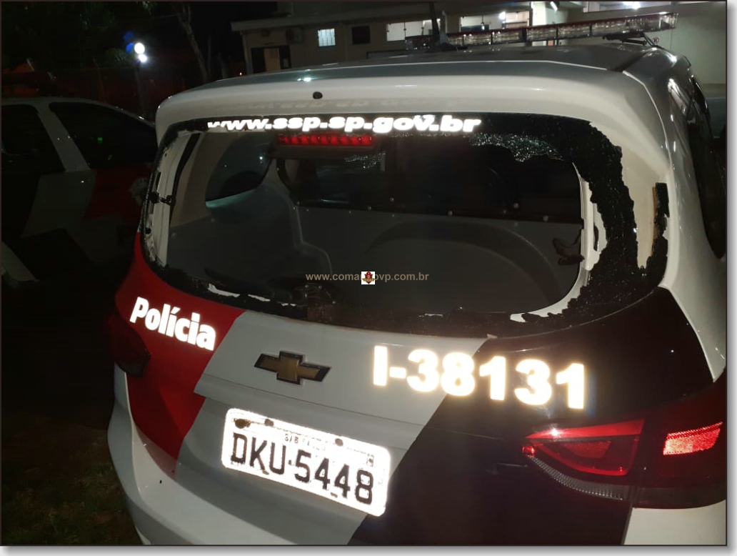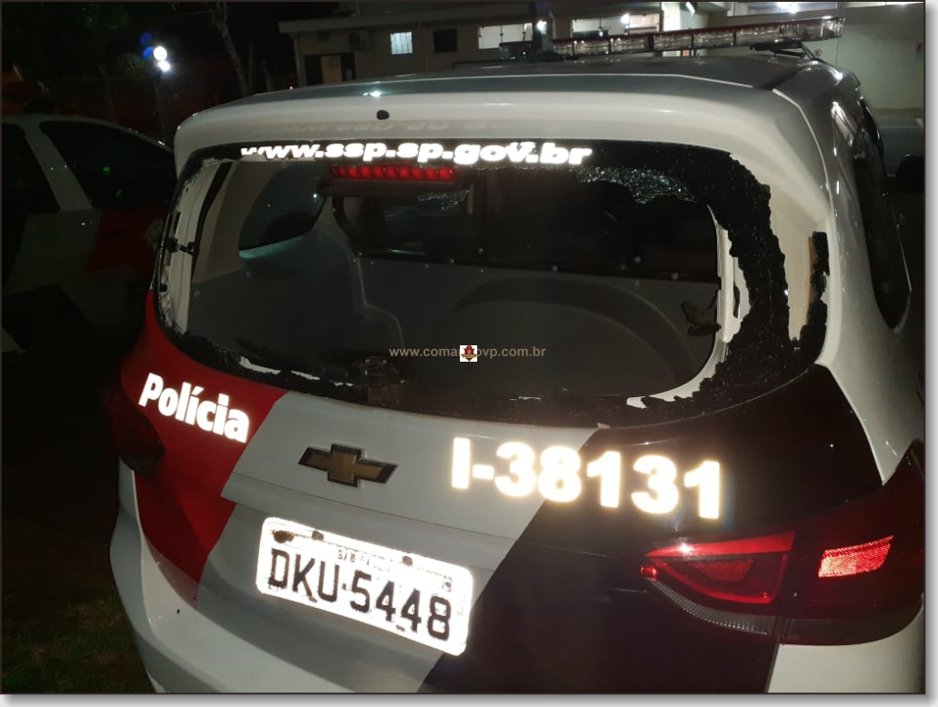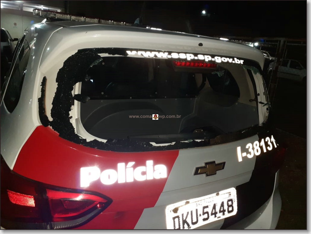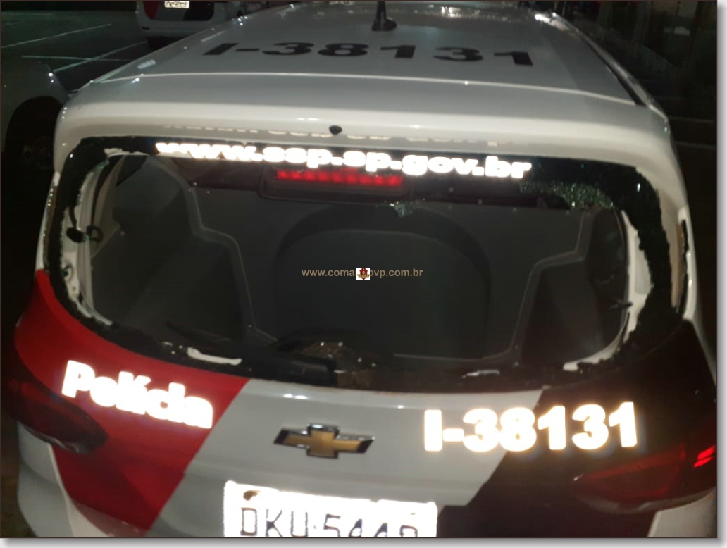 Uma viatura da PM foi danificada nesta tarde de terça-feira, 4 de agosto de 2020, momento que policiais foram atender uma confusão familiar na Rua Otávio da Silva, bairro Cidade Aracy, São Carlos-SP.