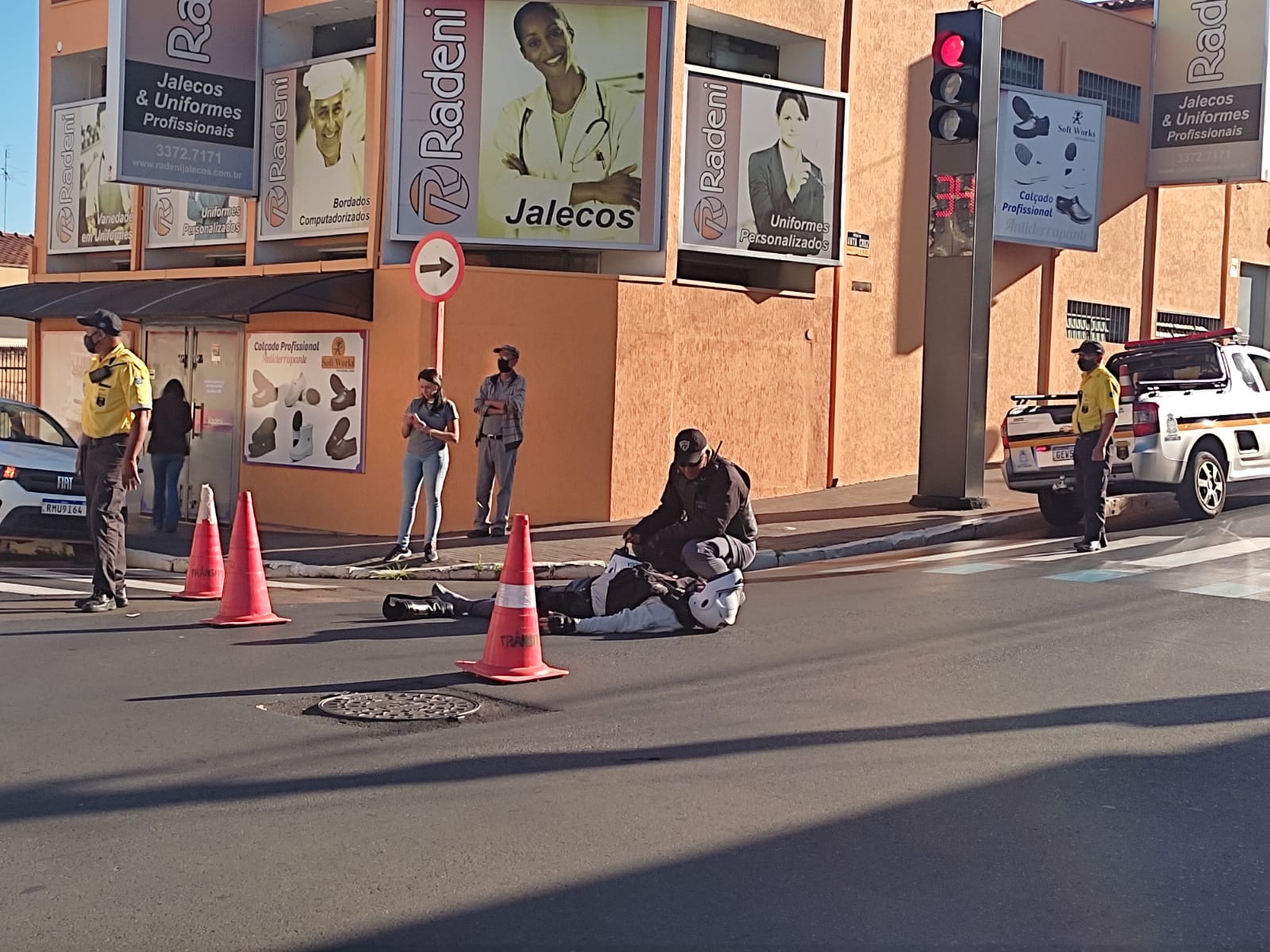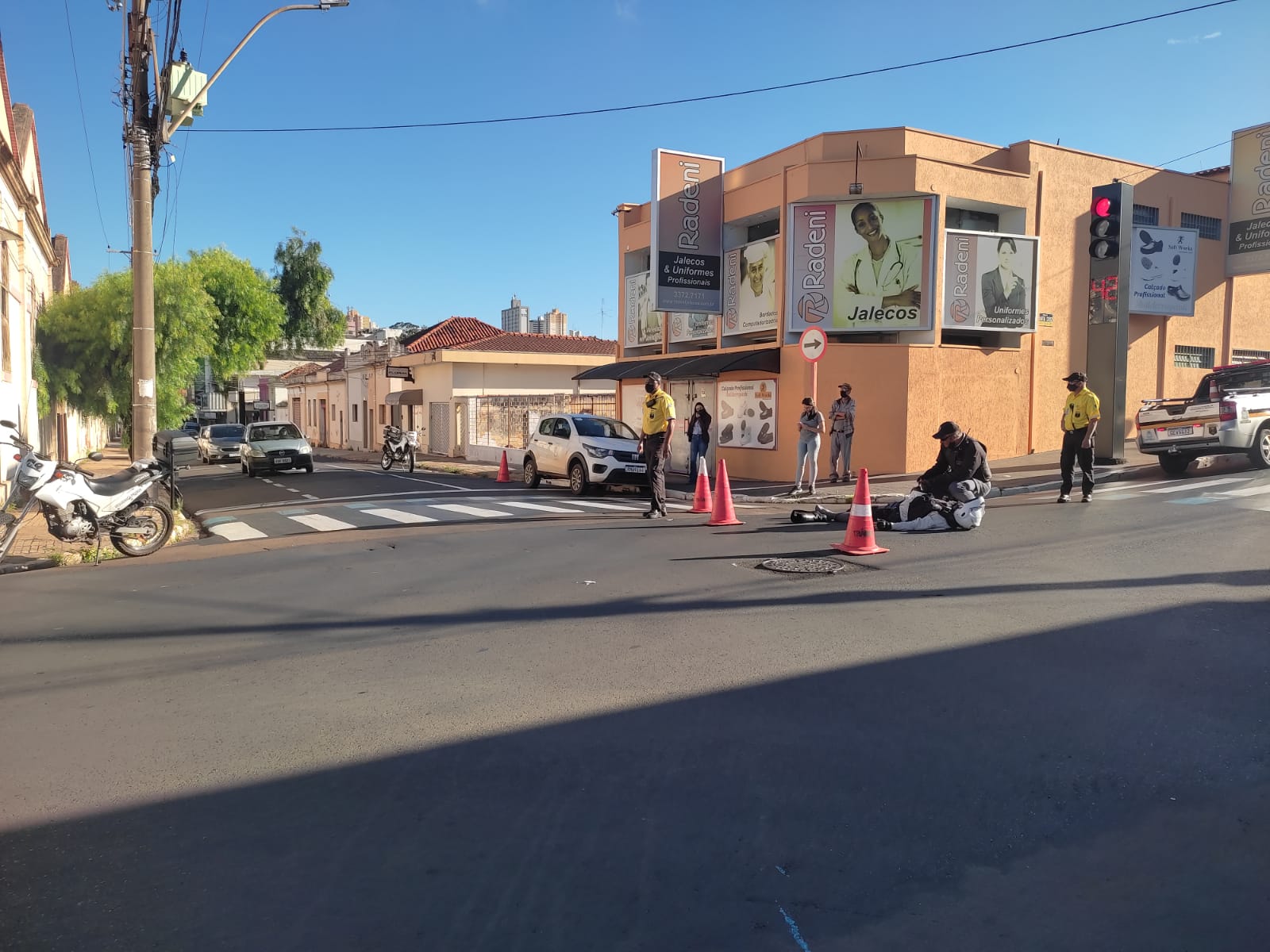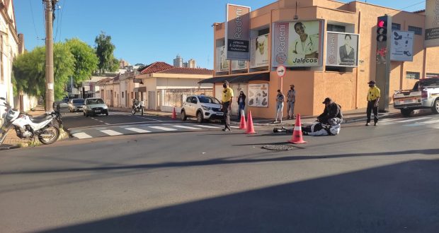 Um vigilante nome e idade não informados sofreu um acidente de trânsito nesta manhã de quarta-feira, 8 de dezembro de 2021, na Rua Episcopal, cruzamento com Rua Santa Cruz, Centro de São Carlos-SP.